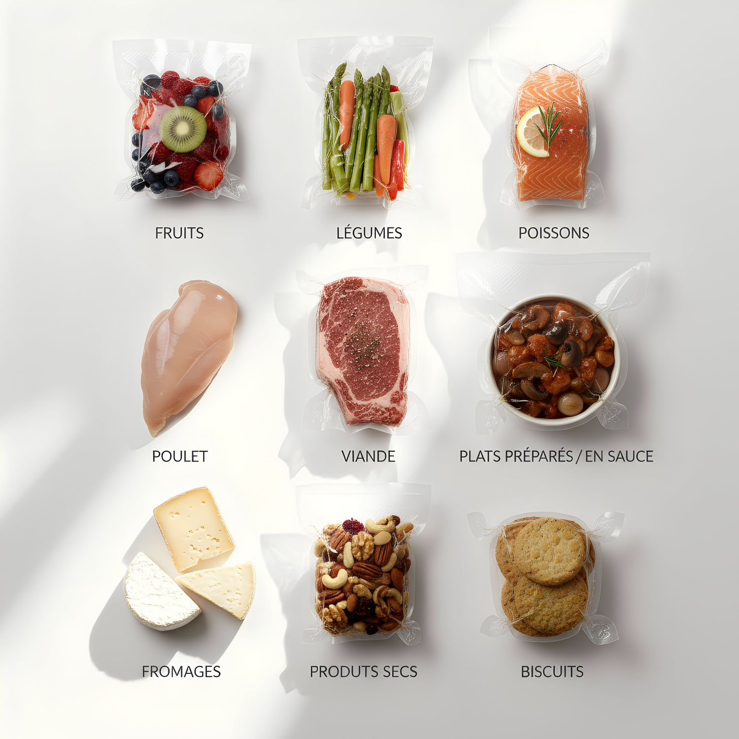 La mise sous vide convient aux viandes, poissons, fromages, fruits, légumes, produits secs et plats préparés. Elle préserve la fraîcheur et prolonge la conservation, aussi bien au réfrigérateur qu’au congélateur.