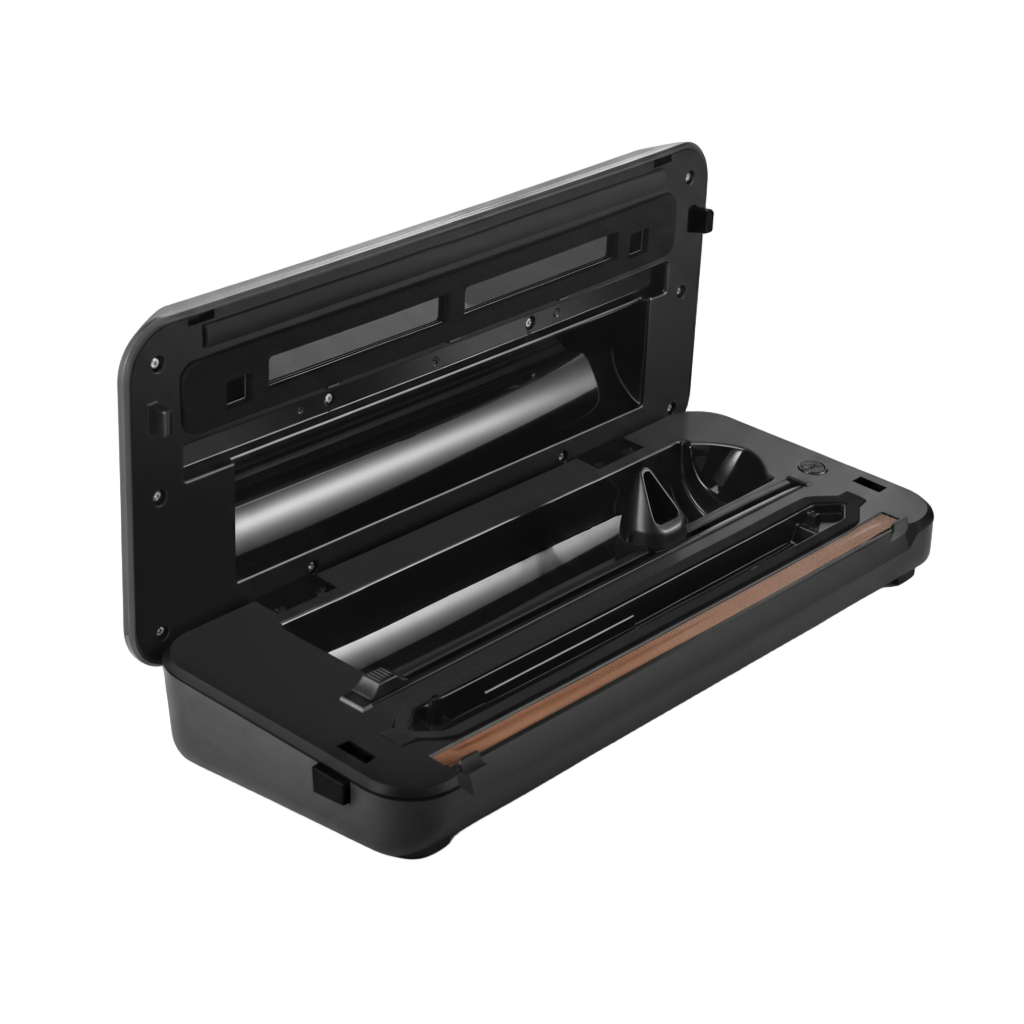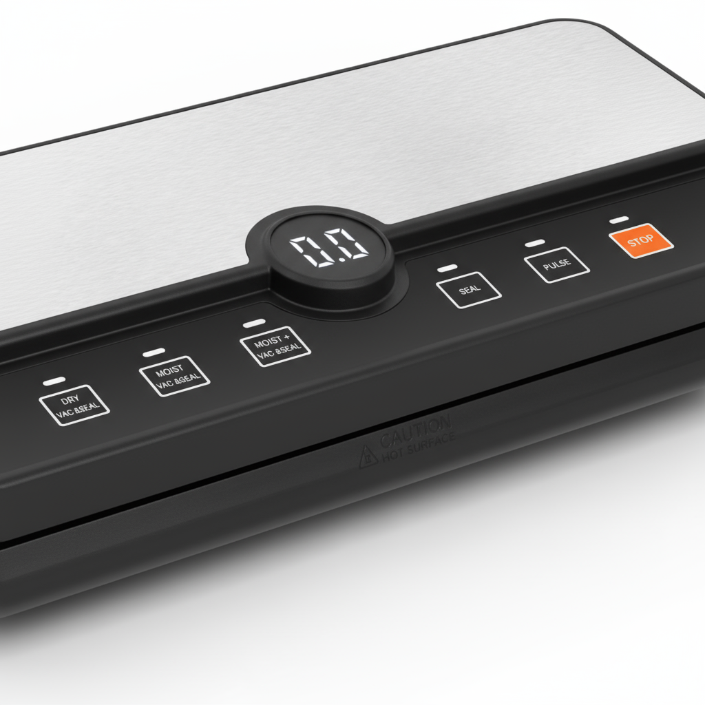 Machine à sceller sous vide automatique, 5-en-1, avec modes sec/humide/pulse, coupeur intégré, pression –60 kPa, panneau tactile et protection anti-surchauffe, idéale pour la conservation et la cuisson sous vide des aliments.